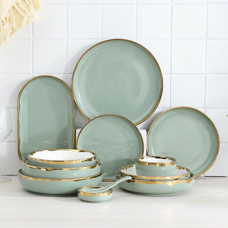 bộ chén bát đĩa ăn màu xanh viền vàng cao cấp free ship
